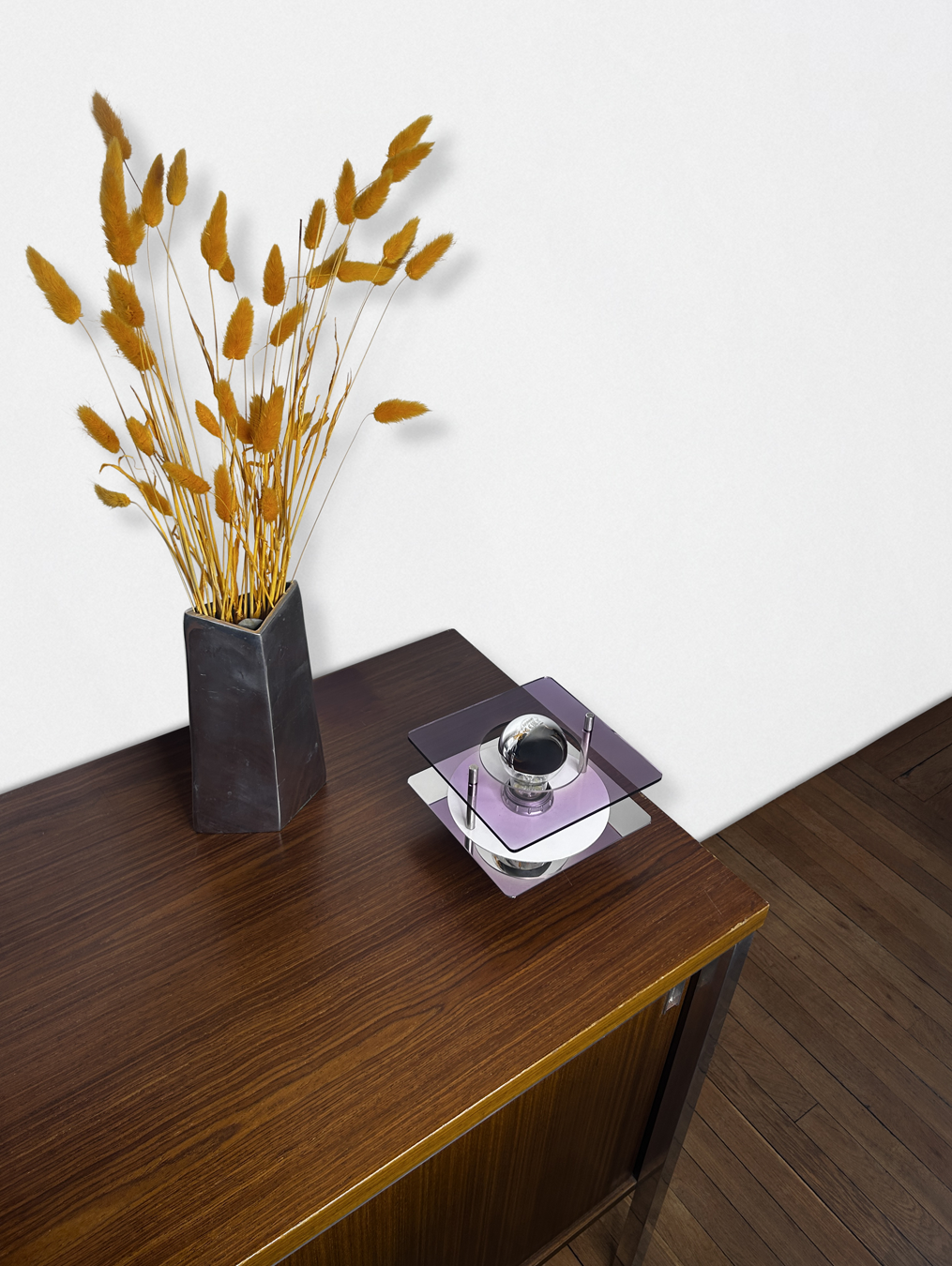 Plaque de plexiglas transparente violette, chassi en acier chromé.