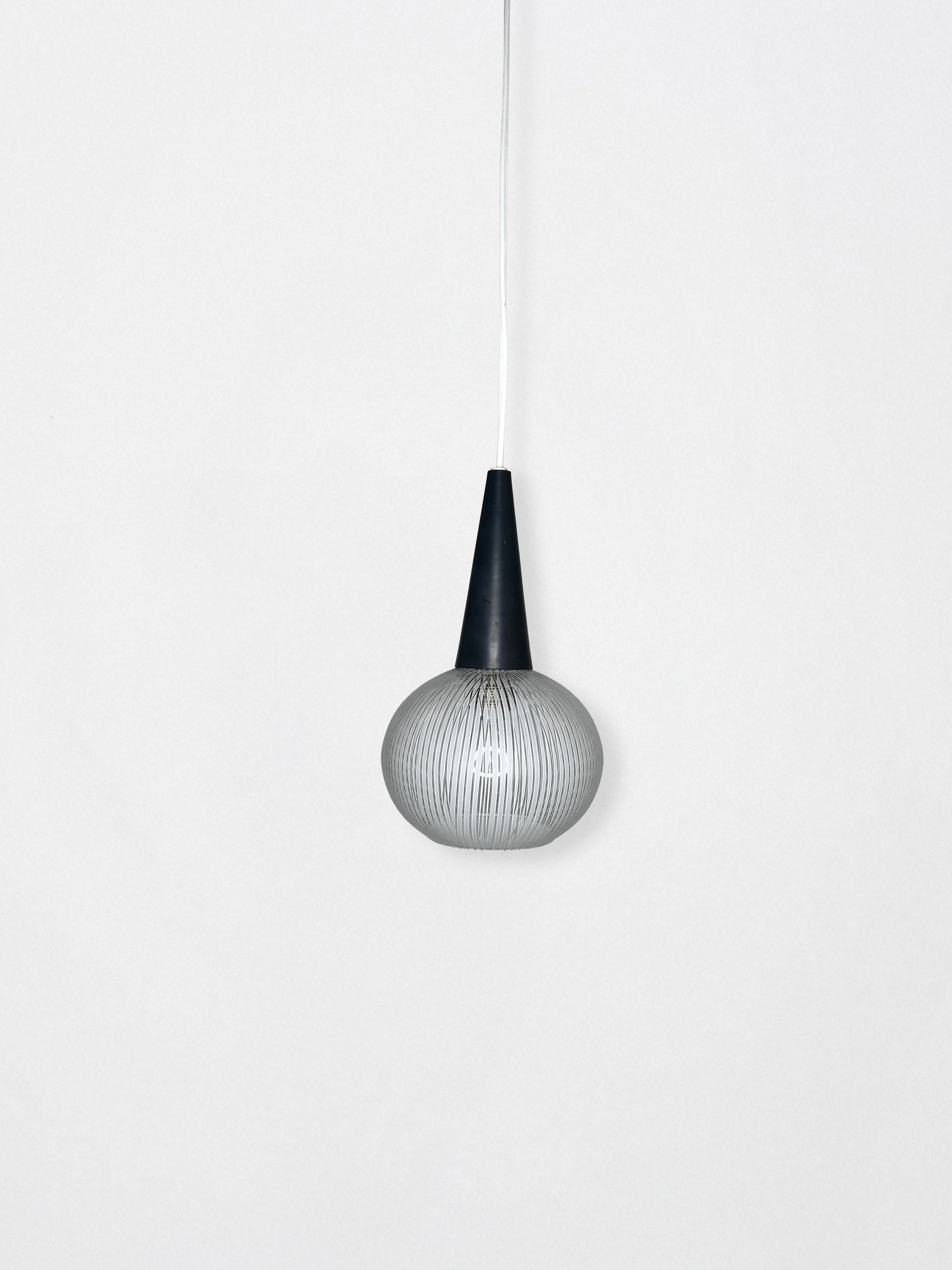 Suspension des années 50, style Art Déco en verre avec des rayures très graphiques.Très bel état, entièrement refaite. Rosace en métal laqué blanc.